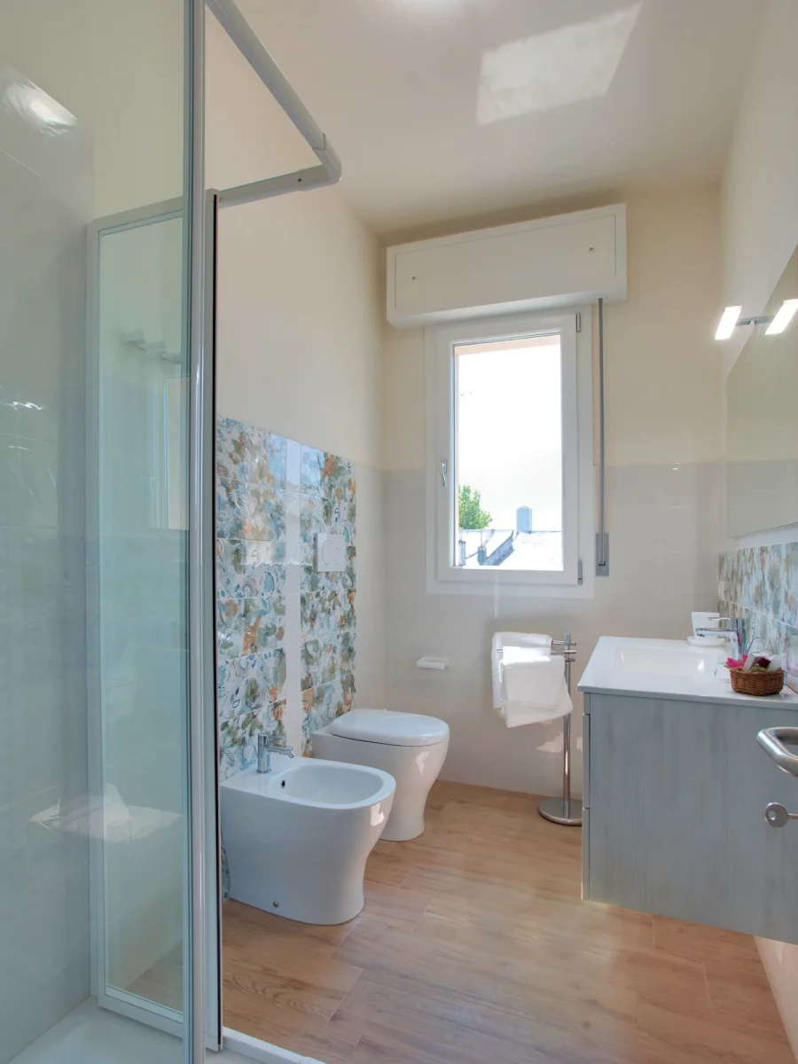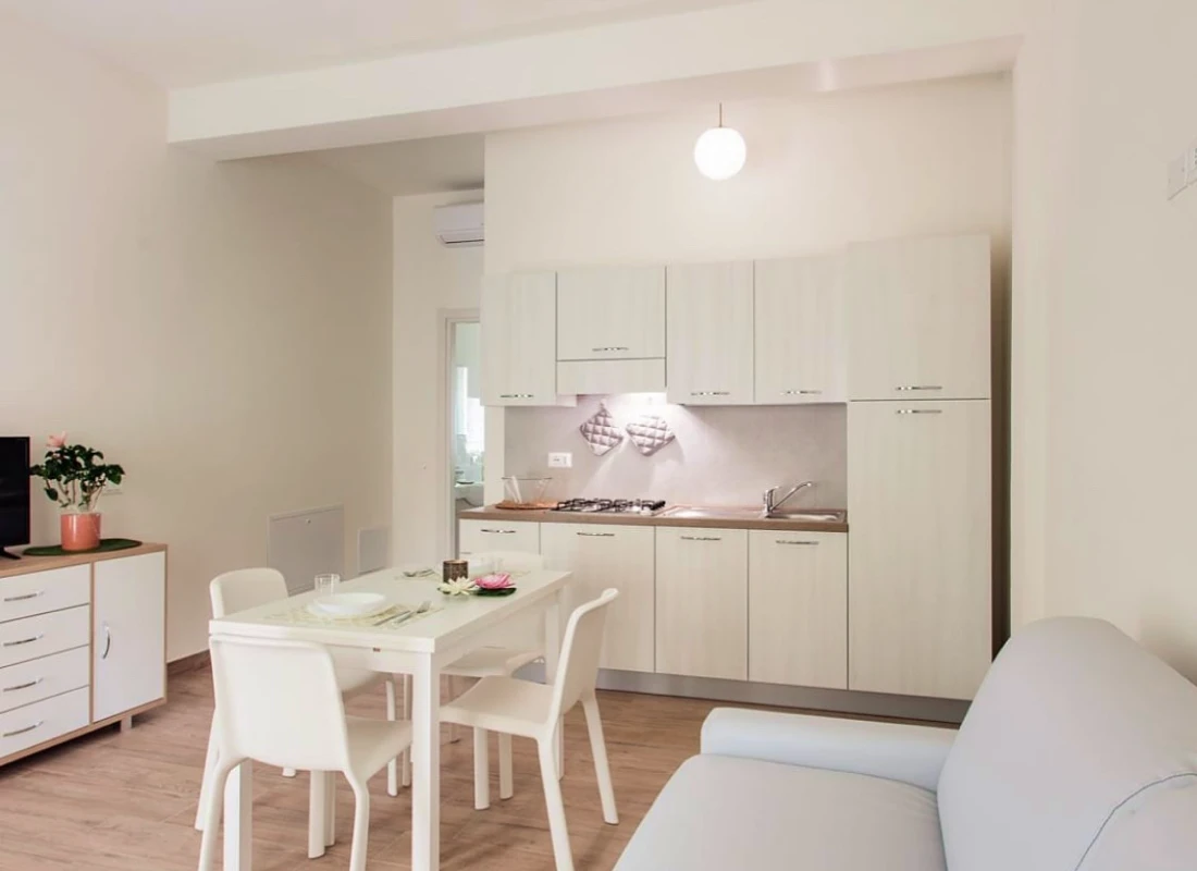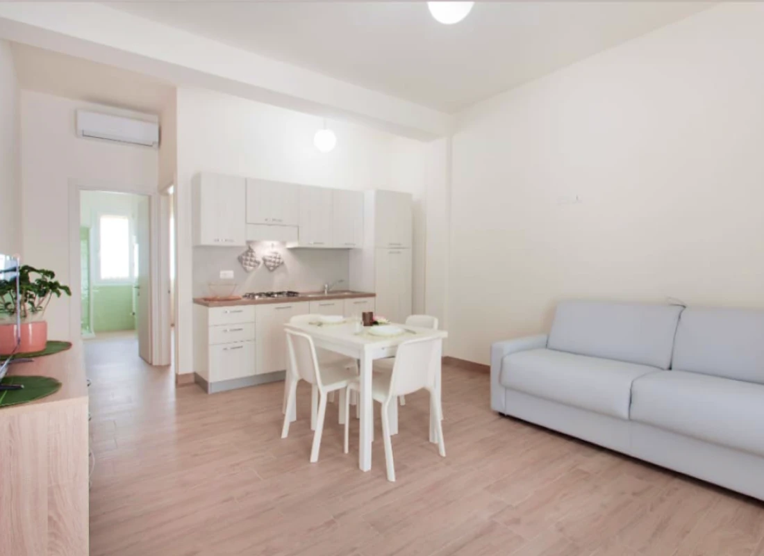 Questi bilocali al piano terra di 40 mq offrono spazi comodi e ben organizzati: una camera matrimoniale luminosa, un bagno finestrato con doccia e una zona giorno con cucina attrezzata e divano lettomatrimoniale. Ideali per coppie, famiglie o soggiorni più lunghi.