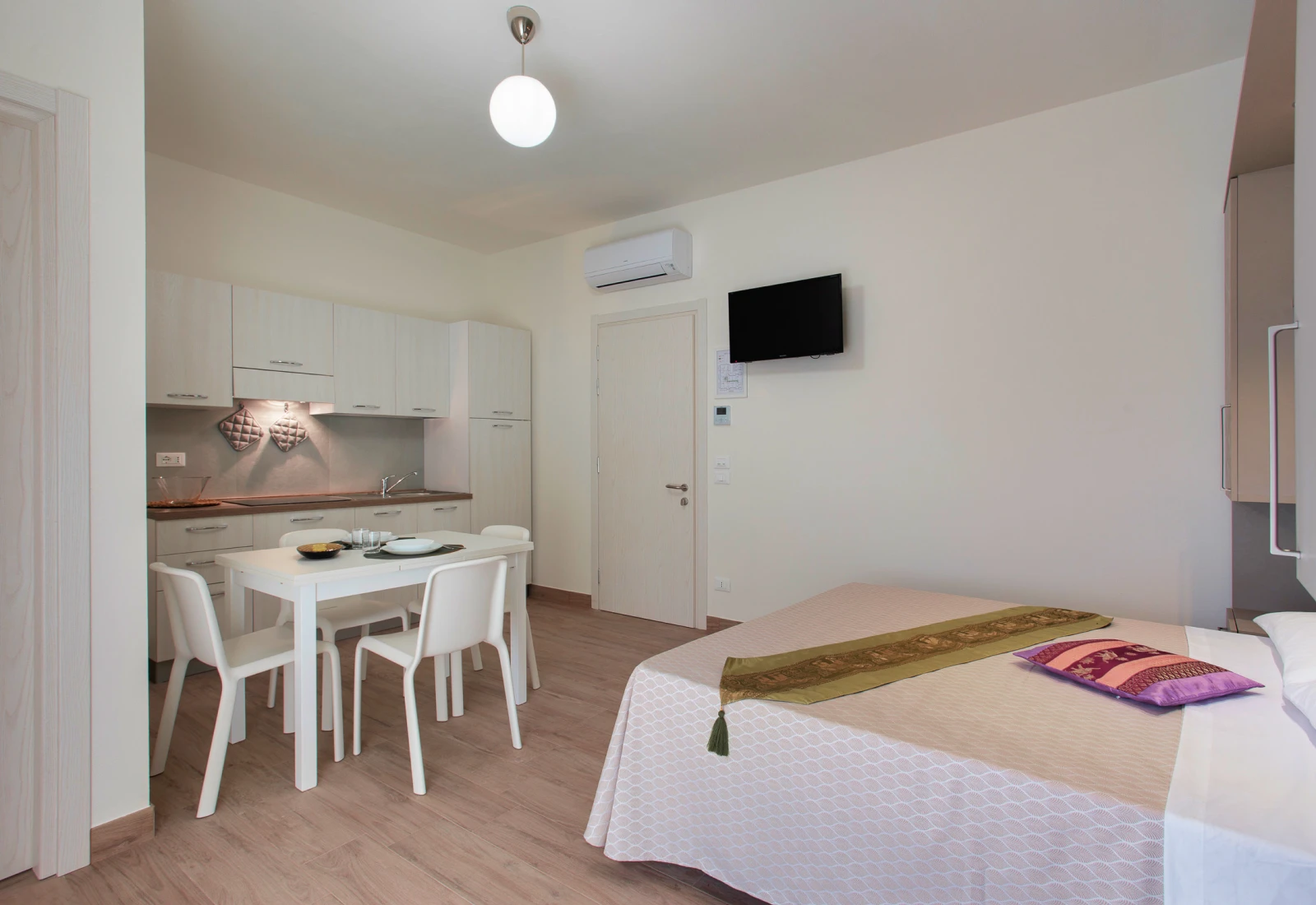 Questi monolocali da 24 mq offrono cucina accessoriata, letto matrimoniale e un terrazzo di 6 mq ideale per rilassarsi all’aria aperta, il bagno, finestrato e dotato di doccia.